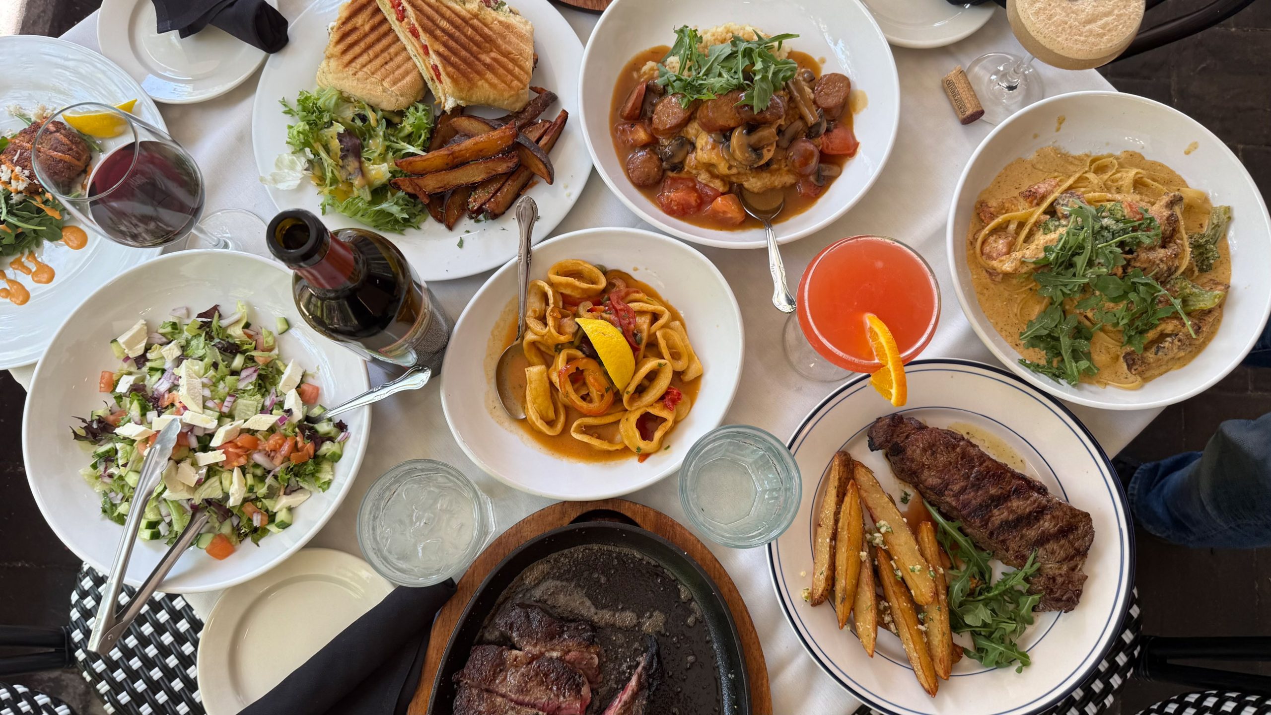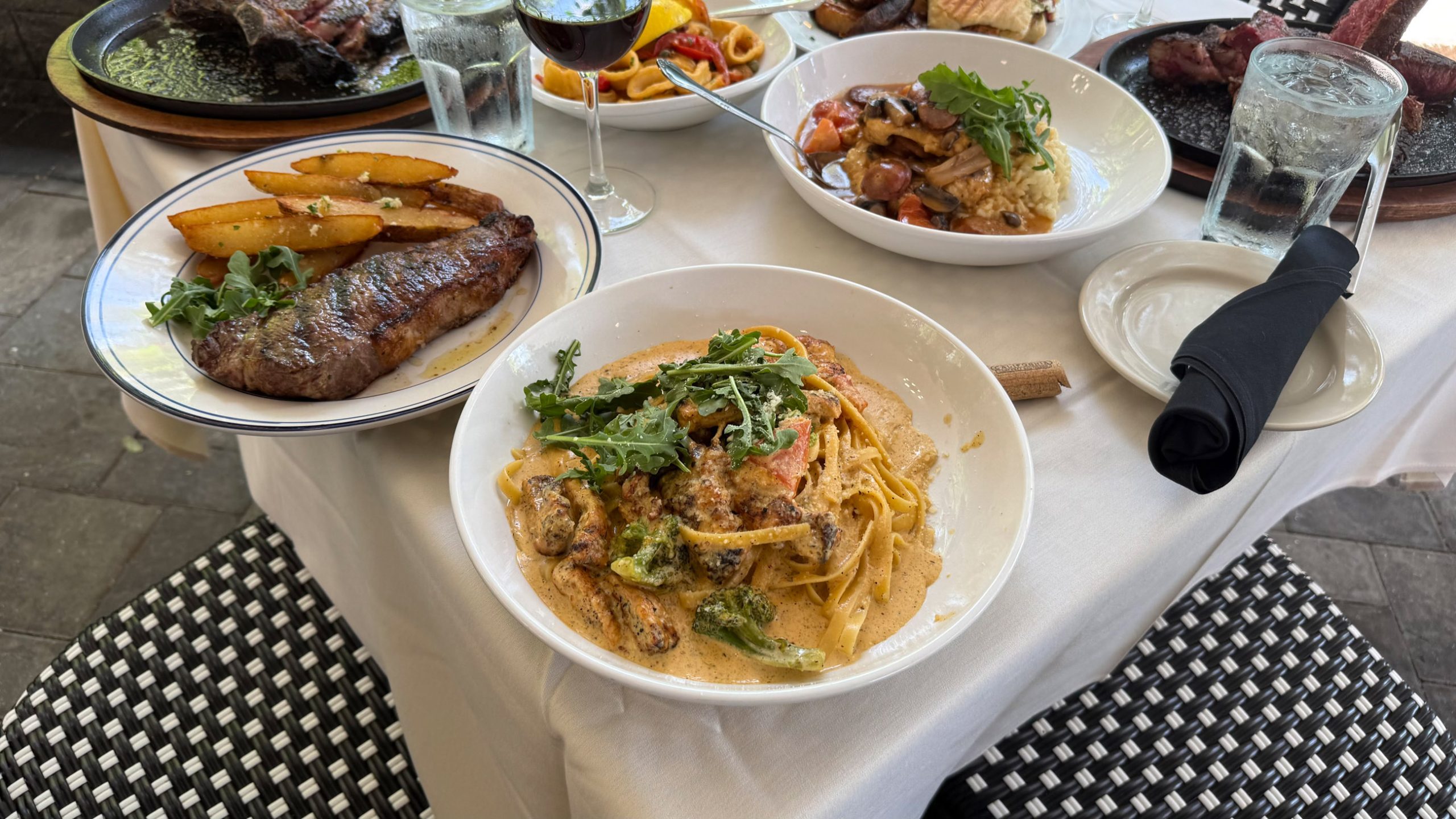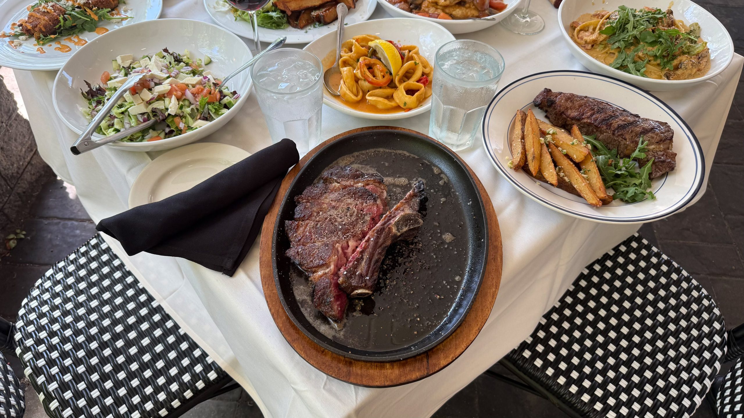Second experience: Came here with a party of 7 for a birthday dinner. Wonderful experience. It was quite busy but all the staff were friendly. We did have to wait a bit for our table even though we made reservations. The appetizers of calamari, combo, and fig flatbread were delicious. I got the salmon entree, very good. One person from our table ordered the porterhouse for 2 and it was enormous! Had a piece, and it was very tender and juicy. The sides were great sizes too. The restaurant brought complimentary shots for everyone for the birthday along with dessert. Great night!